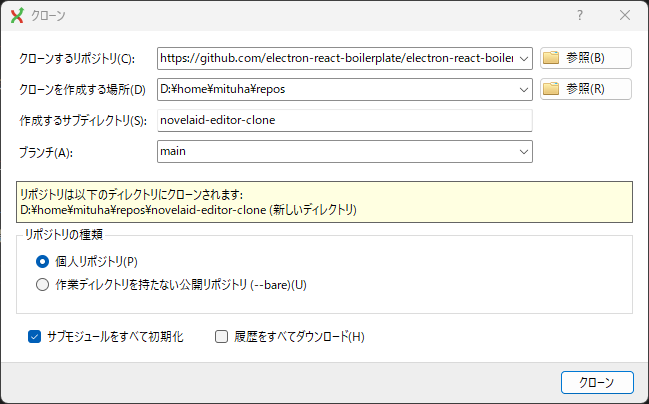 ちなみに、Electron版で.gitフォルダーを削除しましたが、削除しない場合は履歴の関連付けがテンプレートのプロジェクトに関連づいたままとなり、後でえらい目にあいました。
