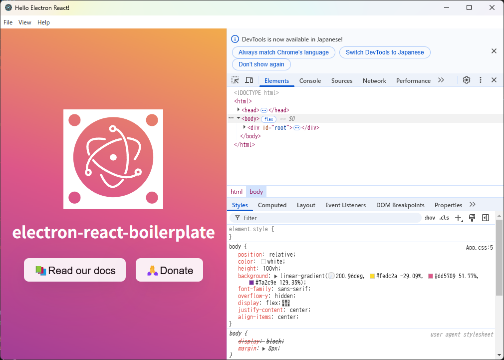 Electronのサイトにチュートリアルもありますが、今回はElectron React Boilerplate を使って作成します。