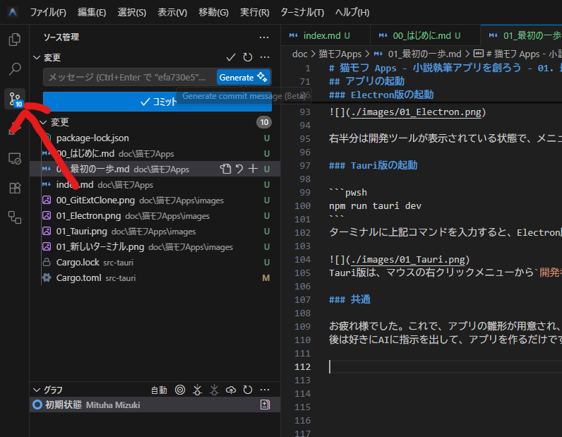 Tauri版はソース管理(Git)の初期化が行われていないので、リポジトリを初期化するのボタンを押して初期化して下さい。