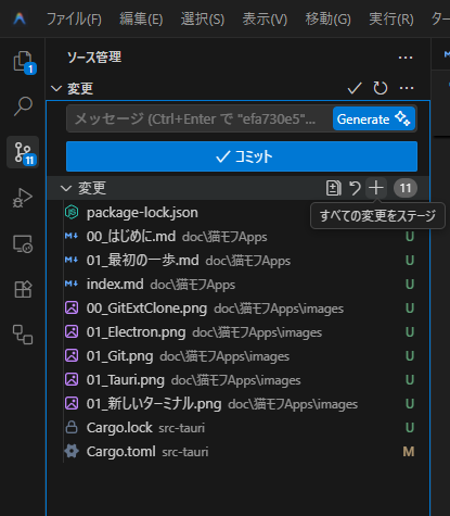 次に、変更の横の+ボタンを押して、変更をステージングします。